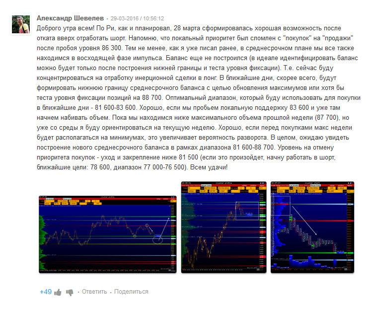Давно с интересом читаю и изучаю ваши материалы как бесплатные, так и платные. Считаю Ваш опыт на основе анализа объёма рынка новым взглядом и прорывом в трейдинге. В цепочке от эмоции до сделки анализ объёма занимает важнейший этап и отражает конъюнктуру рынка намного правильнее, чем цена, как в классике. Очень мало людей практикуют такие подходы и способны в понятной манере донести эту информацию до людей. Очень благодарен Вам за то, что делитесь своим опытом.