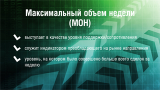 1.1 Максимальный объем неделиВ этом уроке мы поговорим о первом стратегически важном уровне поддержки/сопротивления - о максимальном объеме недели. Данный уровень часто не только выступает в качестве уровня